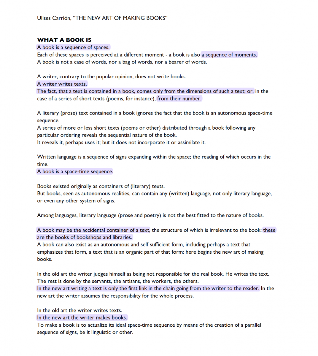 Reading Ulises Carrión's text 'The New Art of Making Books' made quite an impact on these 6 images task. I found her thoughts very interested and different from what I personally thought about books and her insights made me change my perspective radically. Her perception of the writer as a bookmaker really makes a lot of sense. Back in the day, writers would only write a text which would then be copied and handwritten by monks, etc. whereas now a writer needs to not only think about the quality and meaningfulness of the text but the meaning of the book as an object and idea behind its format, design, etc. in correlation to its audience. In other words, the publishing of it is not just an extra task to do, it is one of the key points of the whole process which determines the success of the product (creation) itself.