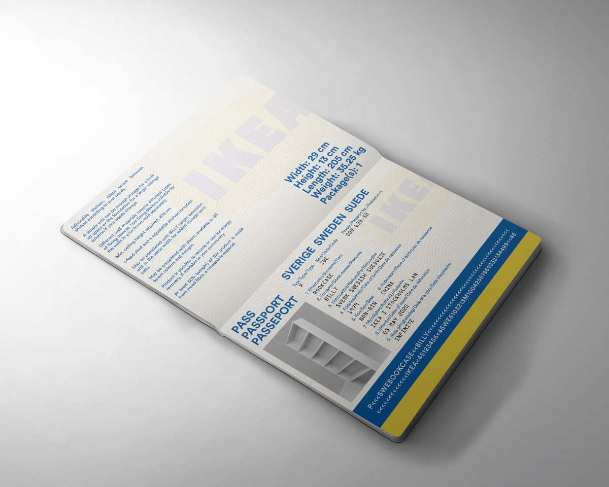 I think a passport is the one and only piece of print that everyone actually owns. They come in a pretty similar size & design, yet have their distinctive details depending on the country (main language, watermarks, layout, etc.) I thought about what else apart from people or pets could own a passport. An idea came to my mind - IKEA, one of the most known brands ever, owning their stores all across the globe, would be a perfect fit. Their most sold item, the Billy Bookcase, made me think about how an object so universal and owned by everyone traveled all these countries without having a passport. Why doesn't it deserve one? It does. So I made it.